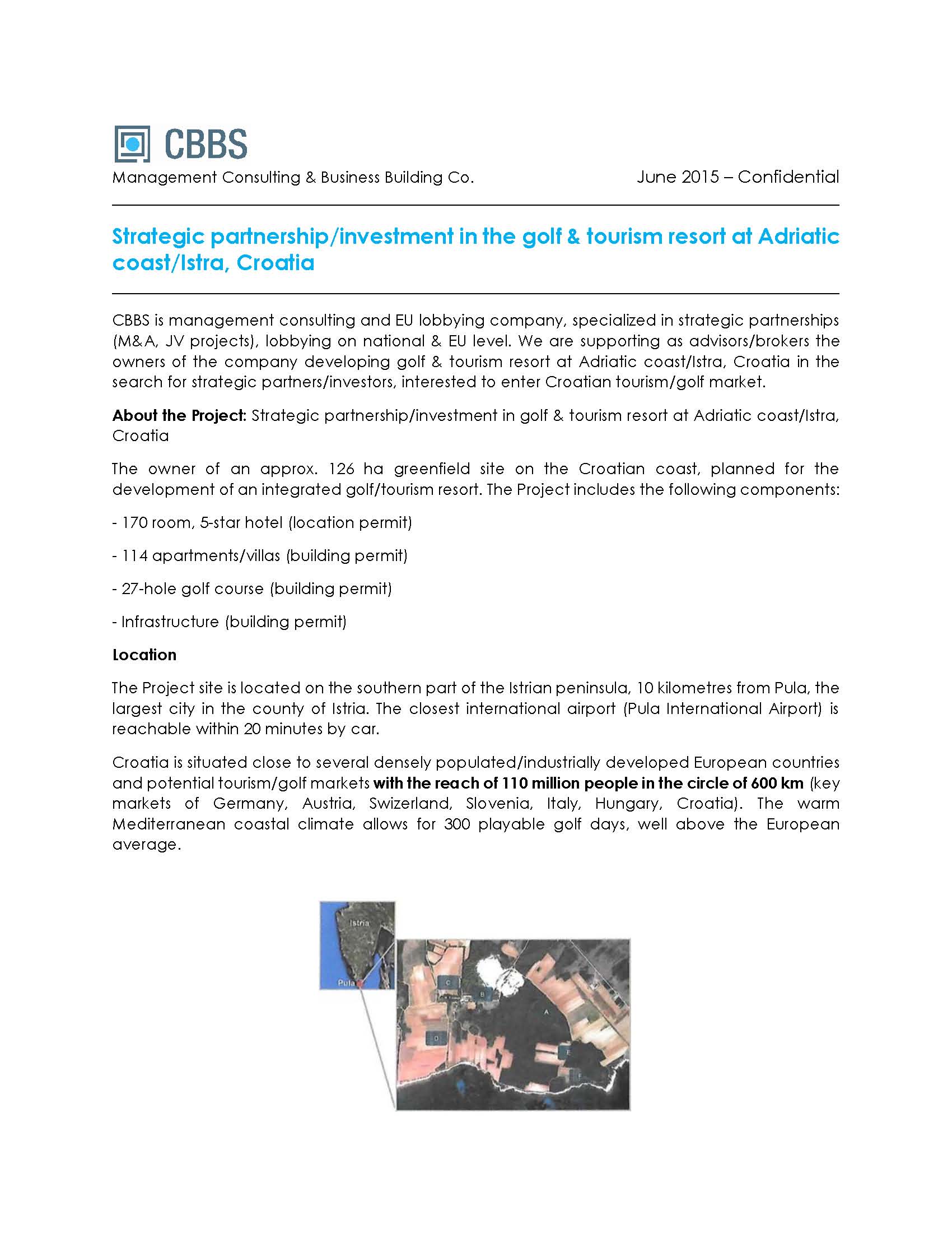 在克罗地亚海岸,位于伊斯特拉半岛南部,有126公顷的绿地,业主计划开发一个综合的高尔夫/旅游胜地。该项目距离伊尔斯特拉县最大的城市普拉10公里。 距离最近的国际机场(普拉国际机场)有不到20分钟的车程。