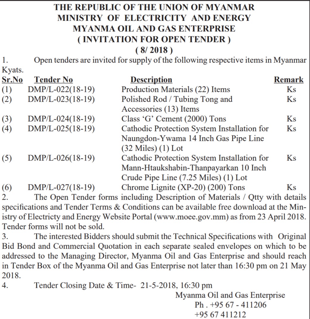 作为缅甸电力和能源部下属企业,缅甸石油和天然气公司以缅甸基亚招标采购生产材料(22项)、G级水泥(2000吨)、铬褐煤(200吨)、阴极保护系统装置、抛光杆及其配件等,可分开投标。