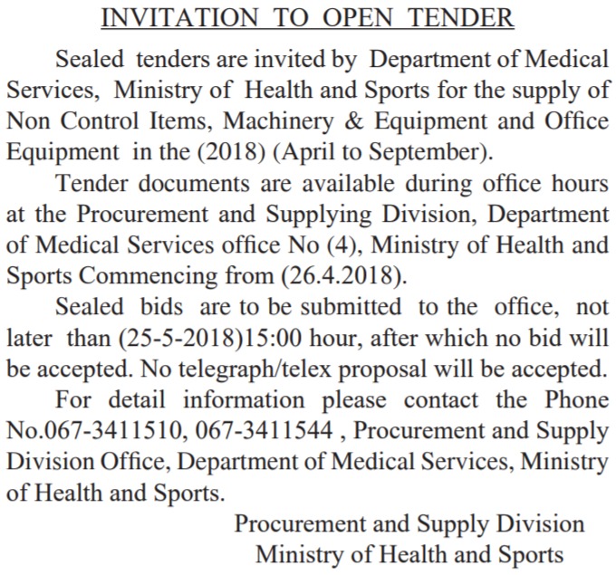 地址: Procurement and Supply Division Office, Department of Medical Services office No (4), Ministry of Health and Sports,Naypyidaw, Myanmar .