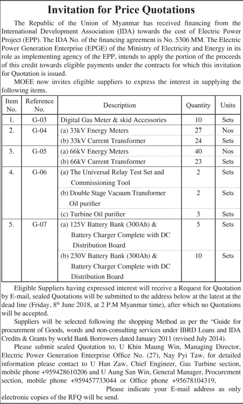 缅甸电力和能源部下属企业缅甸发电公司(Electric Power Generation Enterprise)作为国际开发协会(IDA)提供融资的缅甸电力项目执行方,打算将相关部分资金招标采购变压器、数字煤气表、能量表、电流互感器、万能继电器试验装置、涡轮式油净化器、电池库等。