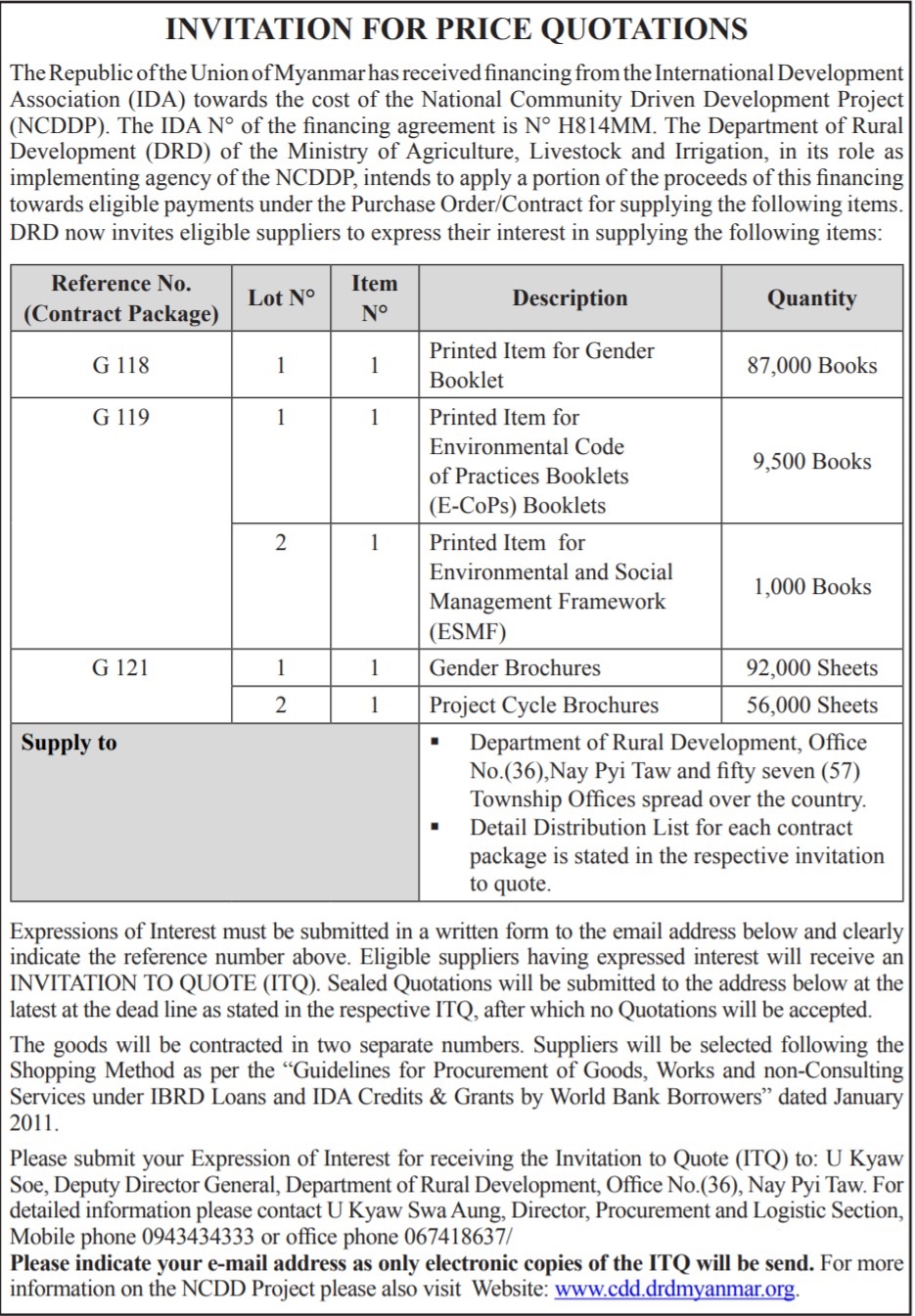 缅甸农业、牲畜和灌溉部农村发展司作为国际开发协会(IDA)支持的缅甸国家社区驱动发展项目(NCDDP)执行机构,打算将项目资金的一部分用于采购各种宣传小册子24.55万个,分成3类5项目招标(详情见附件)。
